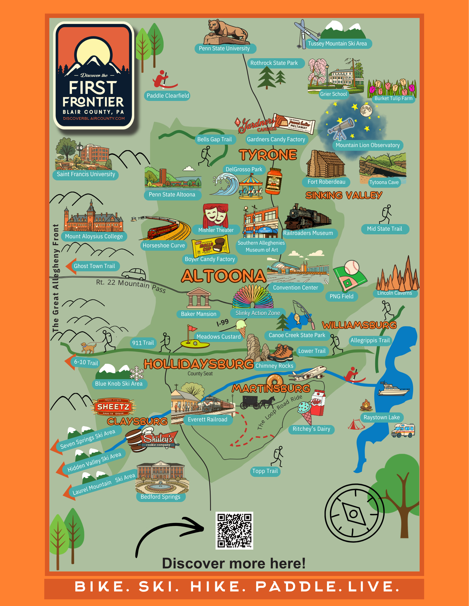 Outdoor adventure is a major part of the Blair County experience, with opportunities for skiing, hiking, biking, paddling, fishing, camping, cave exploring, and scenic road trips all represented throughout the map. Whether someone wants to spend the day on a trail, visit a state park, enjoy winter recreation at a nearby ski area, paddle on the water, or simply take in the views throughout the Allegheny Front and surrounding valleys, the map shows how closely connected Blair County is to the outdoors.